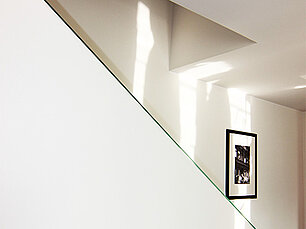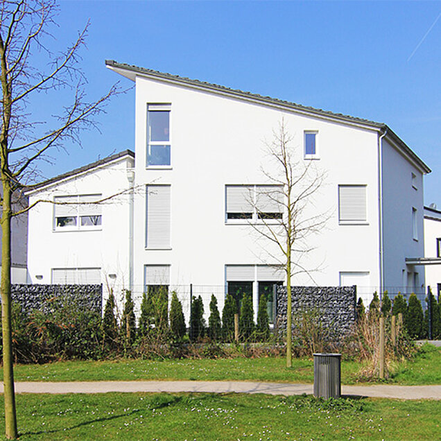Die Beheizung erfolgt mit einer geothermischen Wärmepumpe. Die Farbkonzeption des Hauses setzt innen und außen auf die Farbe Weiß erlaubt sich dezente Hervorhebungen.