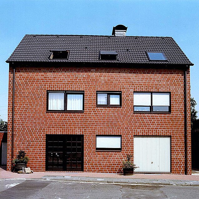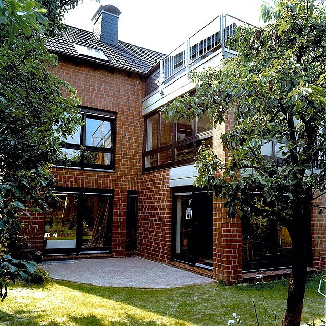 Kennzeichnend für dieses Haus ist die schlichte, geradezu puristische Backsteinfassade. Es handelt sich um den ziegelfarbenen Bockhorner Klinker im 2 DF, Schichthöhe 11,5 cm plus Lagerfuge. Diesen Stein haben wir in den achtziger Jahren sehr gern eingesetzt.