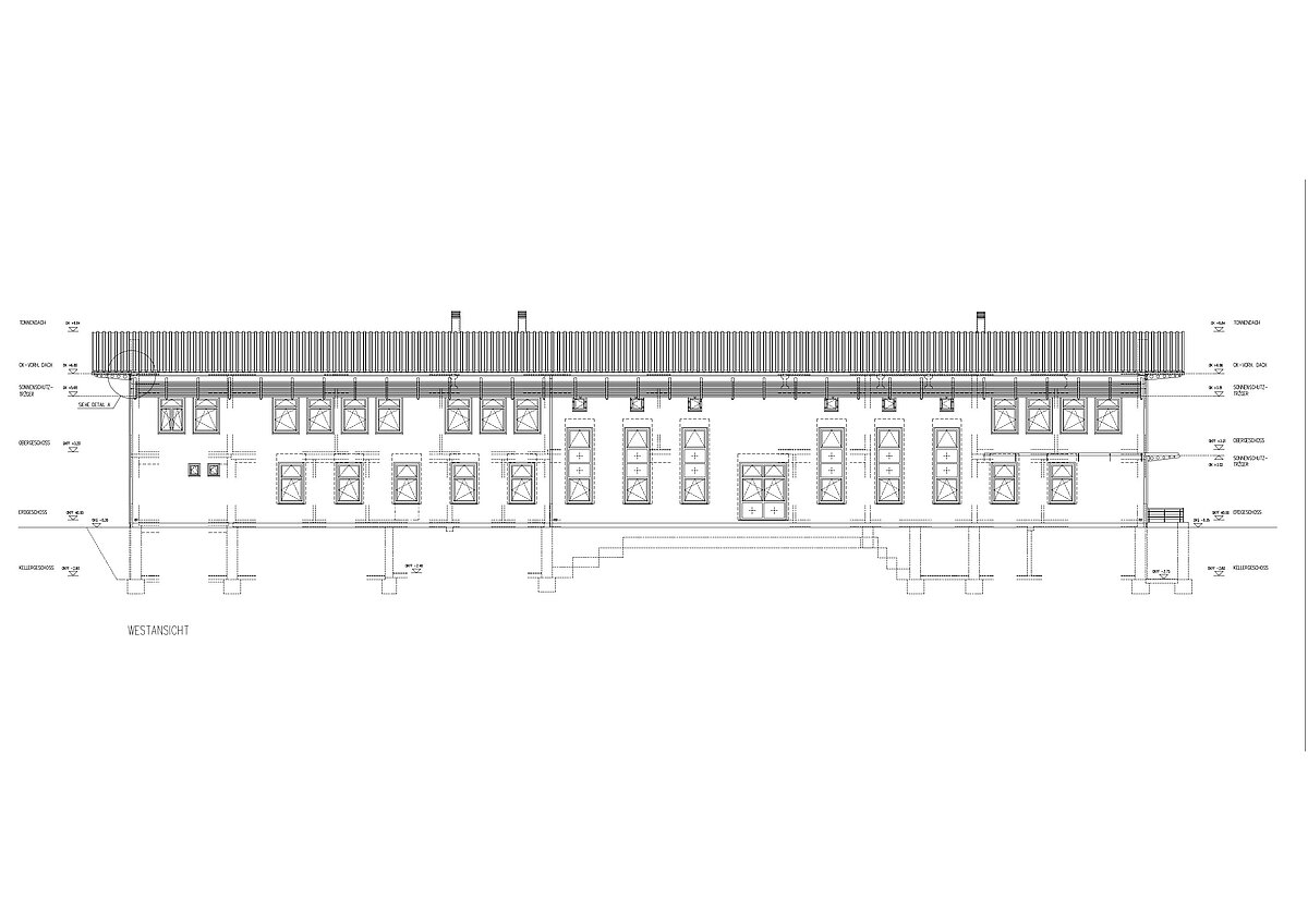 Wir ließen das aufstehende Bauwerk entkernen und anstelle der Sattel-Dach-Konstruktion, die aus ungedämmten vorfabrizierten Betonplatten bestand, eine selbsttragende Halbtonne aus Stahl montieren, die als Kaltdachhülle funktioniert und mit ihren großen Überständen an den Längsseiten den Baukörper gestalterisch fasst.